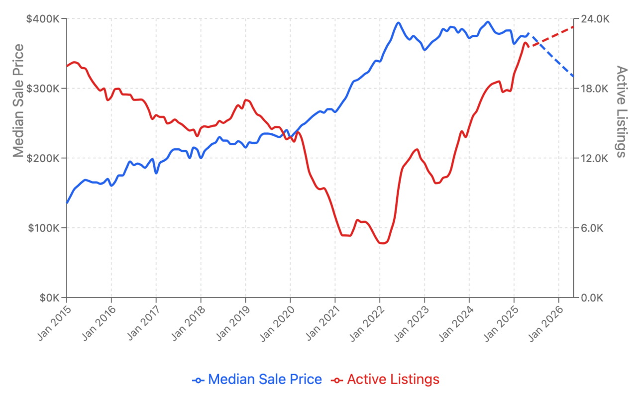 Since early 2024, the # of active listings (red line) have surged above pre-pandemic levels, while median sales prices (blue line) have peaked and are gradually coming down. If this trend continues, we could see home prices continue to fall another 5-10% in the next 12 months or so.